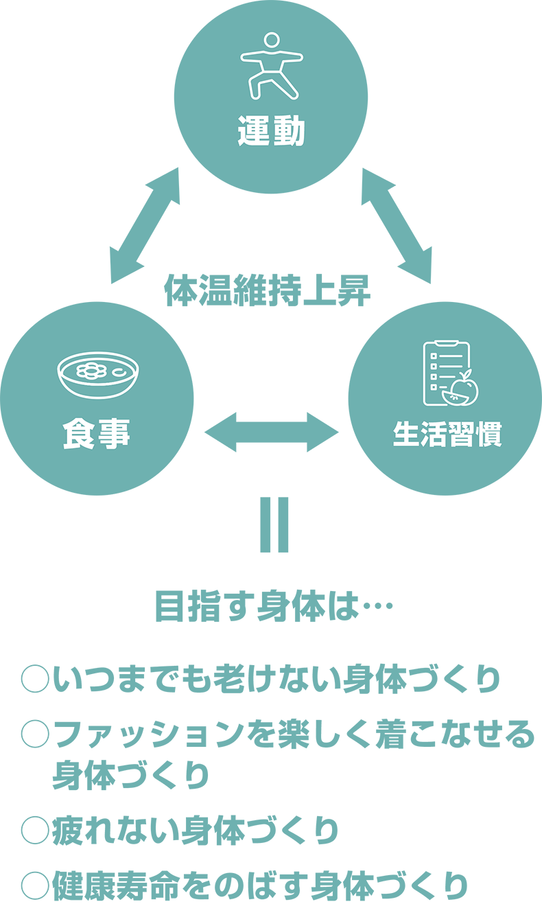 - 見た目も臓器内も短期間で変える、温めながら動かすを推進。