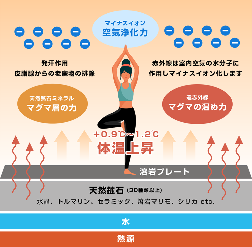 マグマ温浴室は、富士山溶岩プレートと、床下の天然鉱石を一緒に蒸気で温めることで反射する遠赤外線により、間接的に身体を温めるのが最大の特徴。一般的なホットヨガスタジオのように室内を温める際にヒーターや加湿器を使わず、遠赤外線効果による水蒸気で温めるため呼吸がしやすく、サウナのような息苦しさもなく快適な環境で体温を上昇させます。遠赤外線効果によりマイナスイオン化された空気の中、リラックスした状態でトレーニングすることができます。